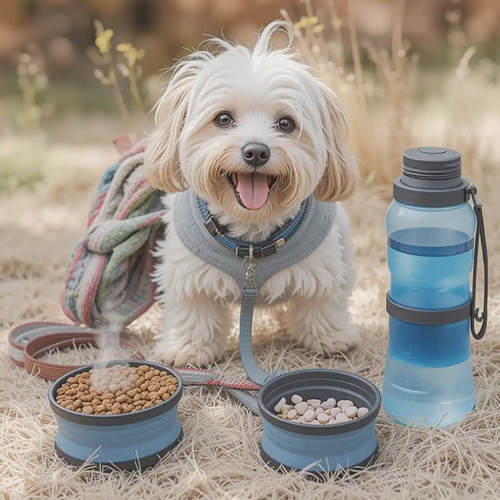 - A collapsible travel bowl and portable water bottle help you stay prepared on the go.